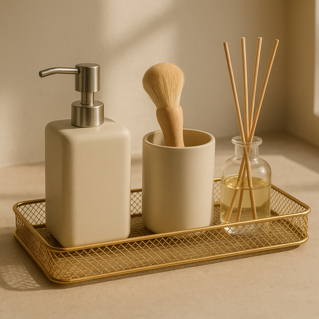 A bandeja dourada para lavabo telada é um elemento que alia estética e funcionalidade, ideal para acomodar sabonete líquido, porta-escovas e um pequeno aromatizador, sem ocupar muito espaço. Ela valoriza metais e revestimentos, acrescentando um toque de personalidade ao ambiente. Para otimizar organização, recomenda-se escolher medidas proporcionais à cuba, combinando com uma bandeja decorativa menor que auxilia a manter os itens do dia a dia perfeitamente organizados e harmonizados. Essa solução oferece um espaço elegante e prático, ideal para quem busca um lavabo que une estilo e funcionalidade sem excessos.