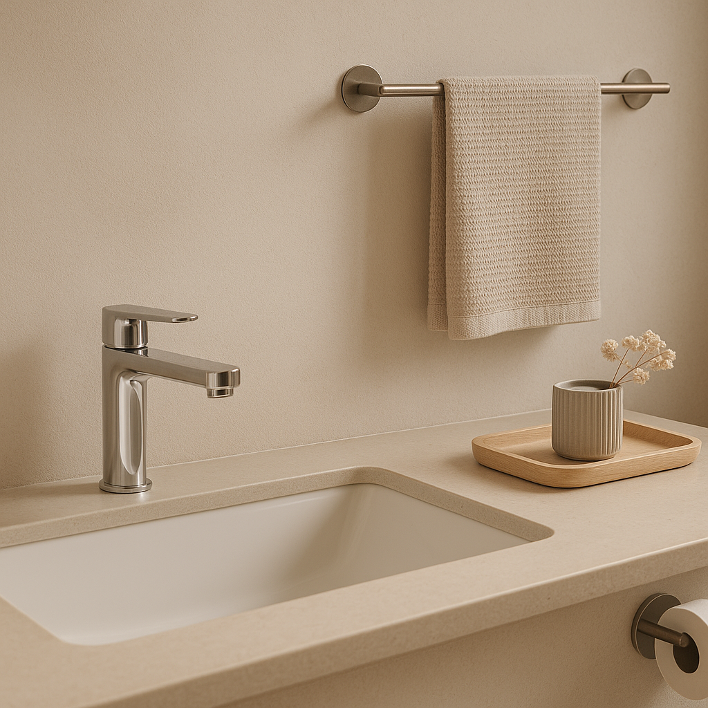 A bricolagem no lavabo começa pelas escolhas certas que influenciam diretamente sua funcionalidade e estética. Elementos como torneiras e misturador monocomando garantem praticidade, enquanto acessórios como papeleira de parede, porta-toalha bastão e bandeja decorativa elevam o visual. Pequenos detalhes fazem toda a diferença e proporcionam um acabamento refinado, sem a necessidade de grandes obras, transformando o lavabo em um espaço agradável e funcional com investimentos pontuais.